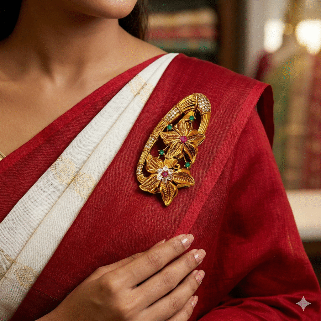 Jevaya Antique Gold CZ Floral Saree Pin Brooch