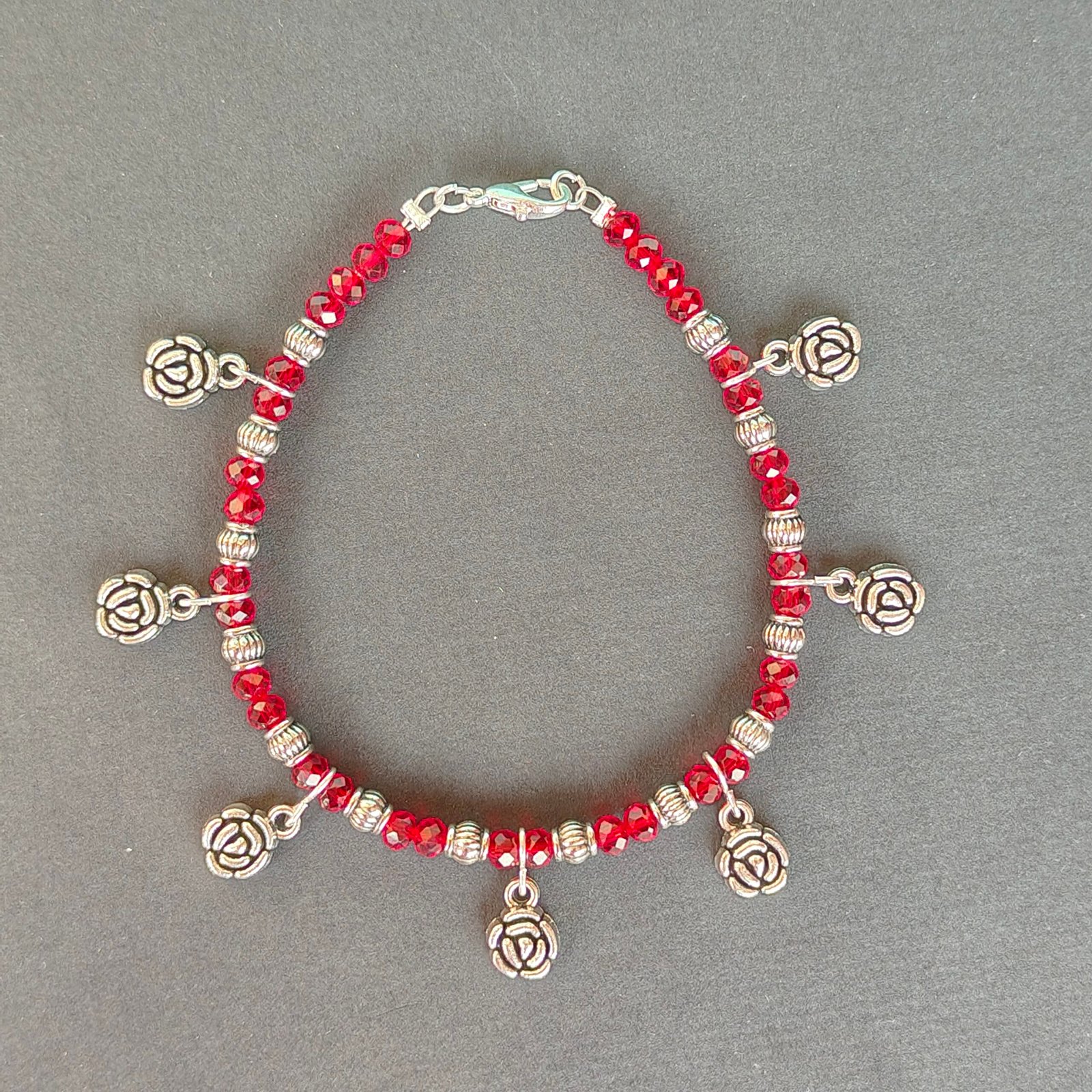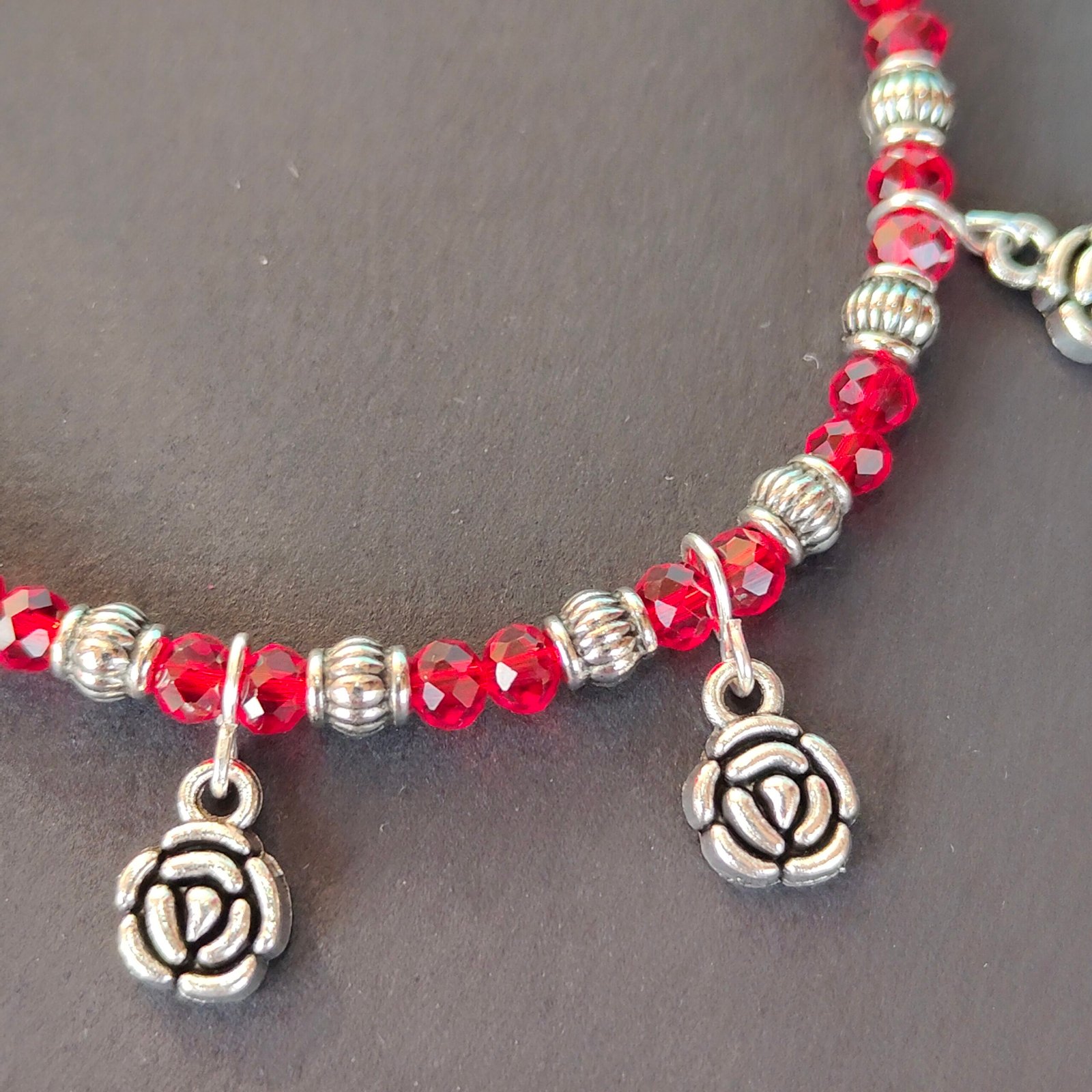 Jevaya Baby Girl Red Beads & Silver Rose Charm Anklet (3–7 Years) – Adjustable Cute Kids Foot Jewelry