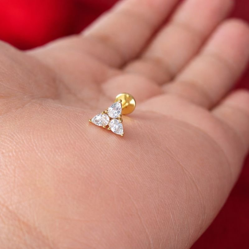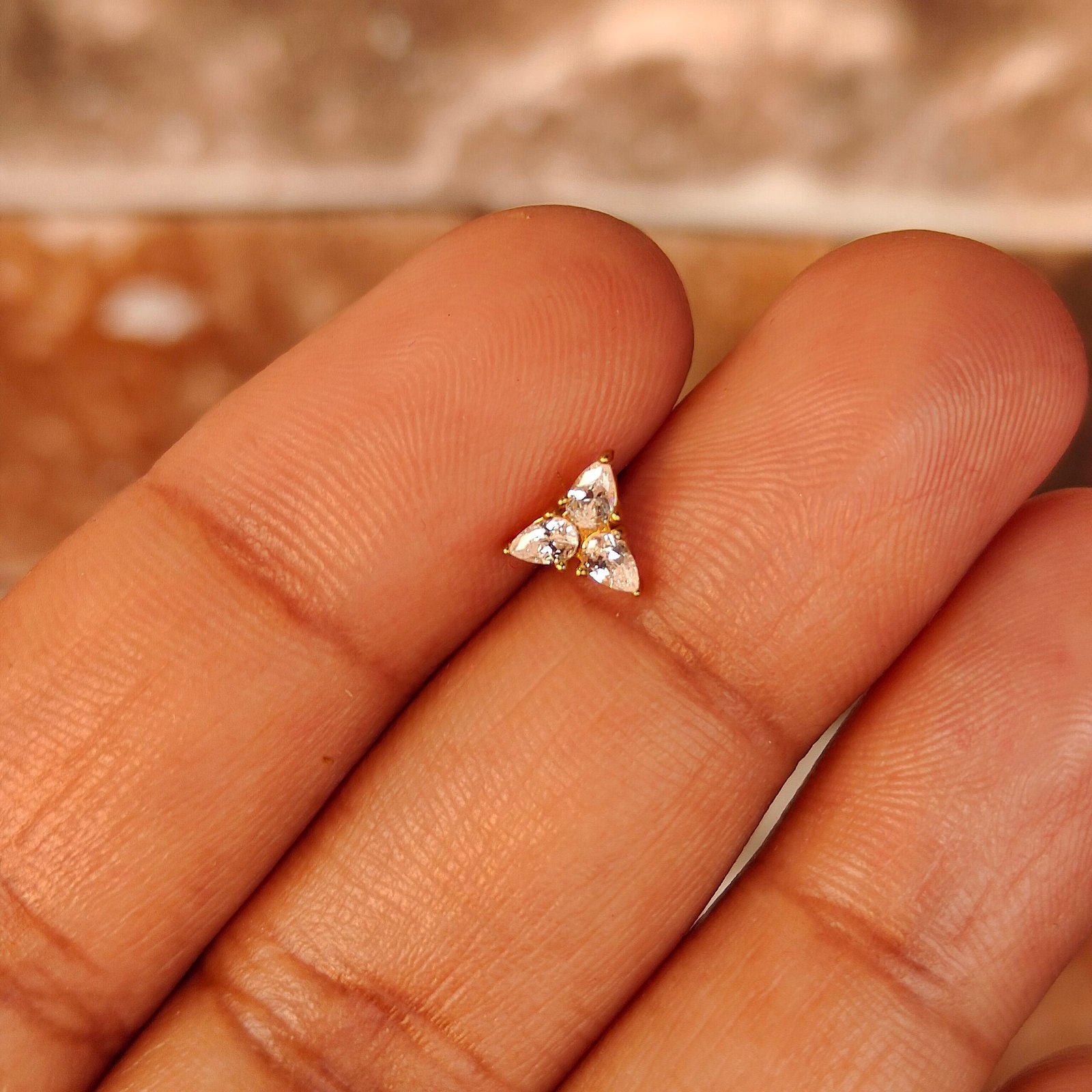 Enhance your elegance with this stylish triangle AD stone nose pin, designed to deliver a subtle yet luxurious sparkle. The unique triangular setting holds three high-quality American Diamond (AD) stones that reflect light beautifully, giving a diamond-like shine.