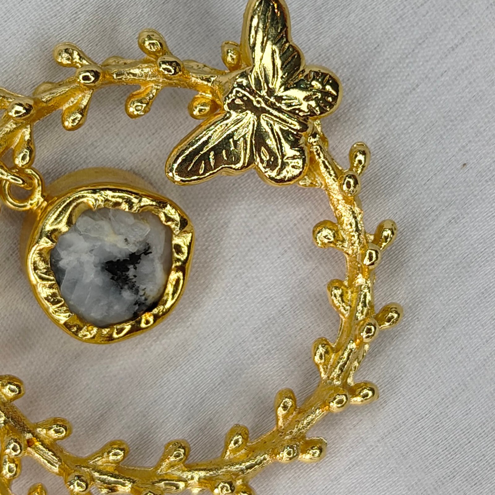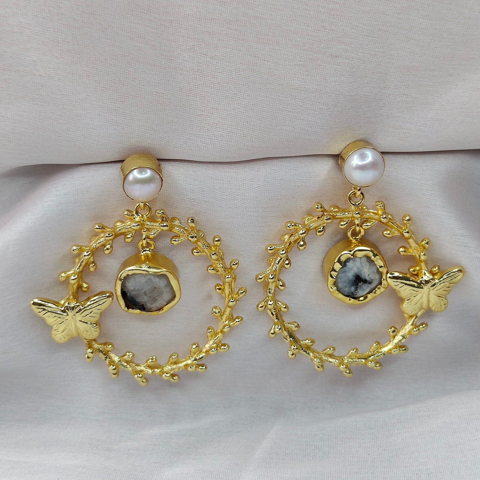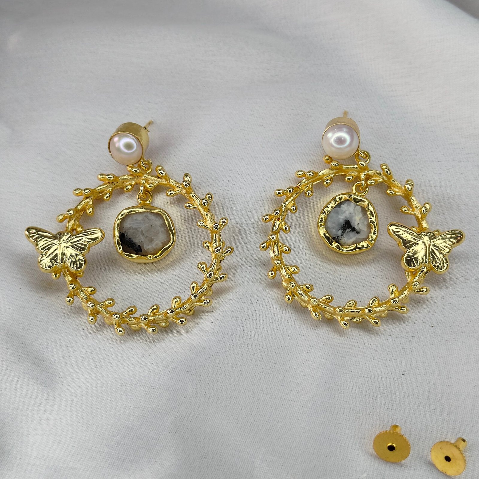 Jevaya Golden Butterfly Pearl Hoop Earrings with Natural Stone Charm