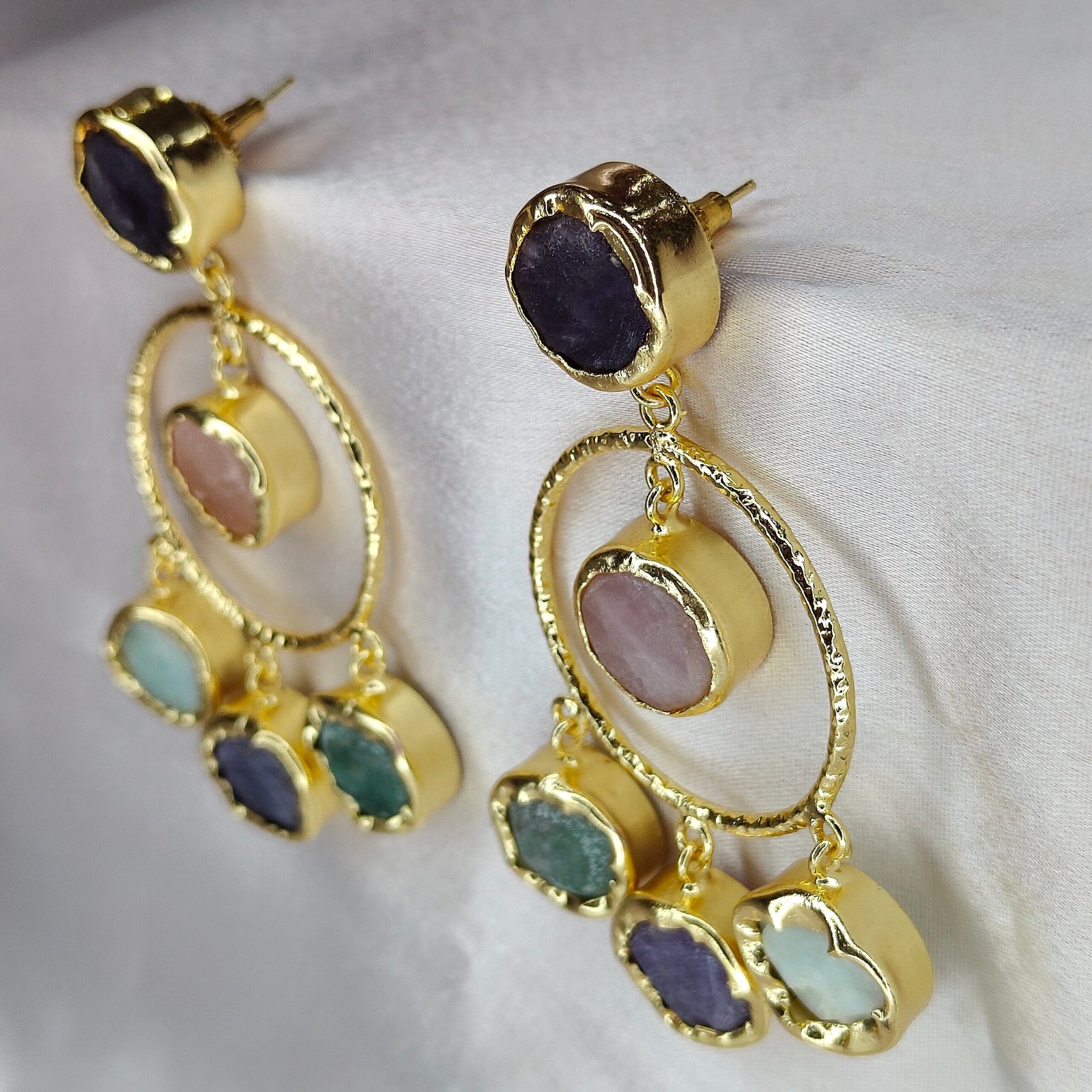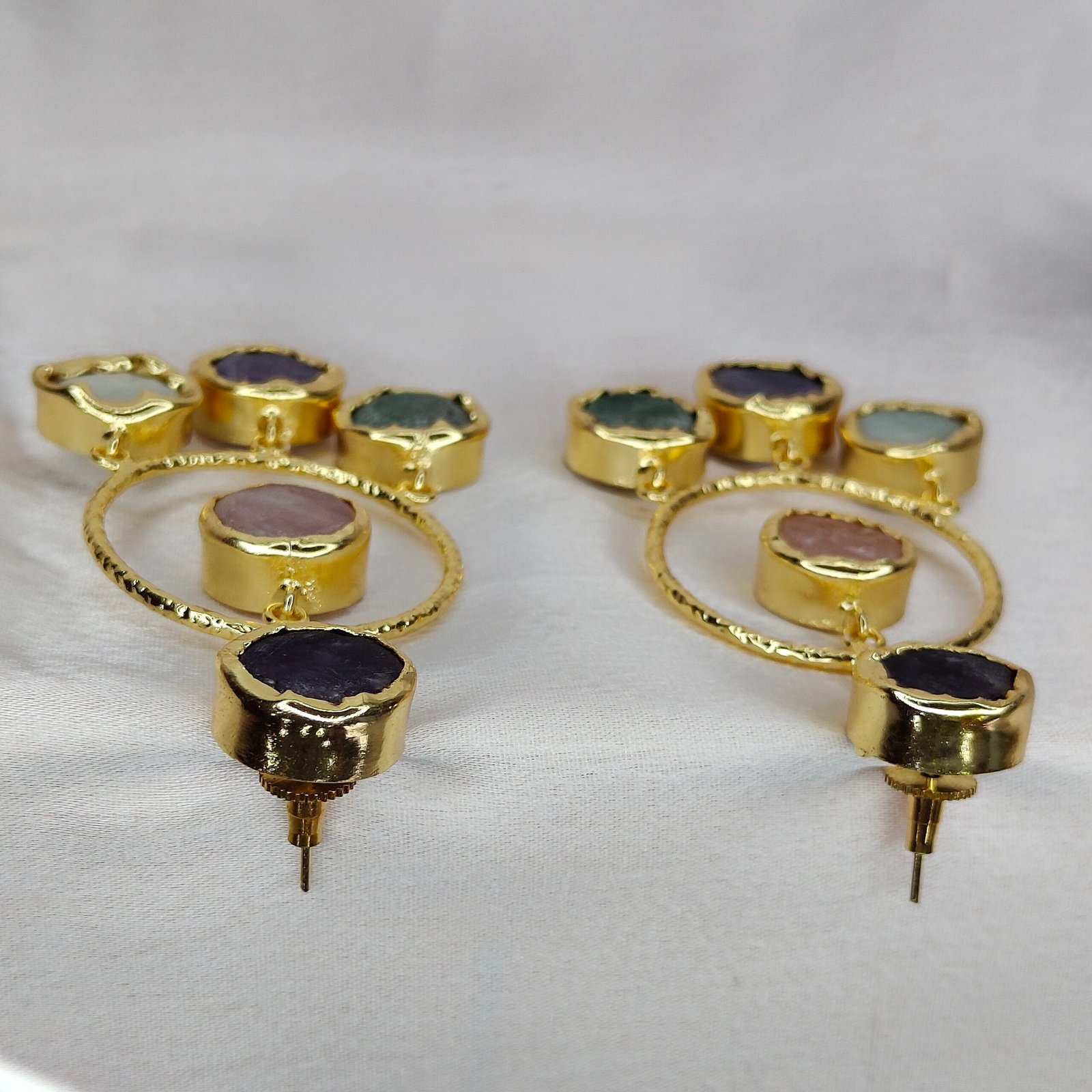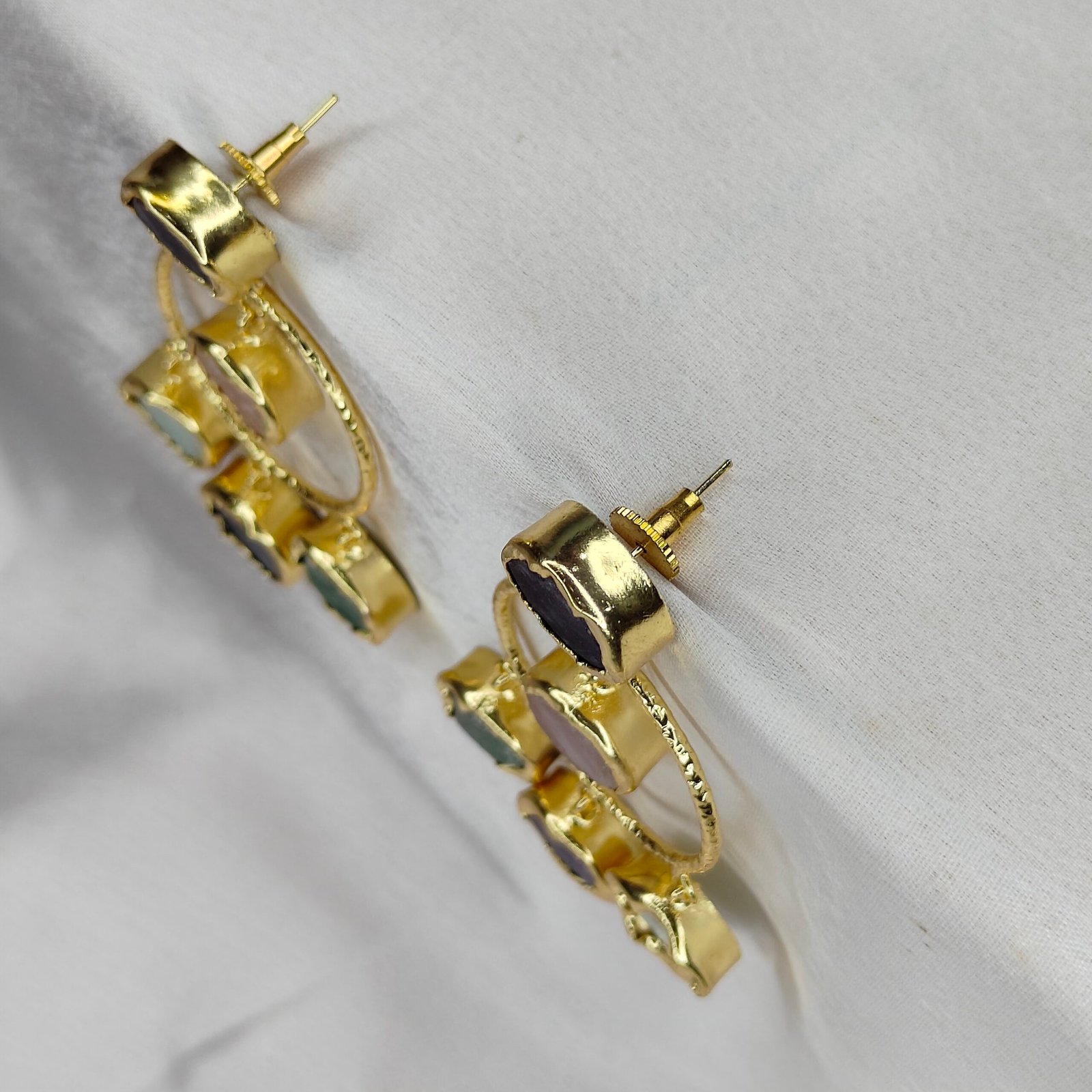 Jevaya Handcrafted Multiple Natural Stone Hoop Earrings with 22k Gold Polished