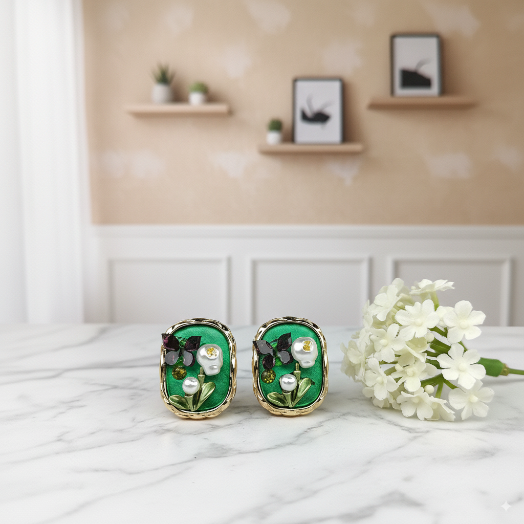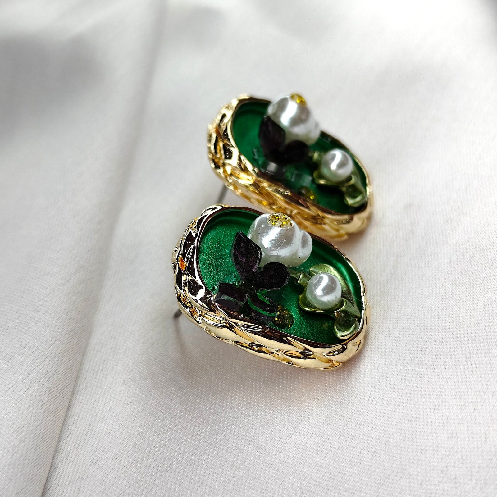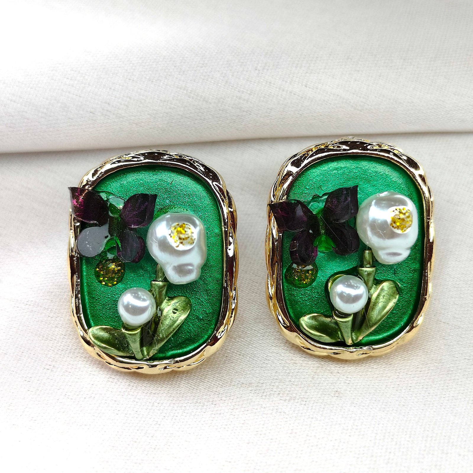 Vintage Floral Pearl Stud Earrings with Emerald Green Enamel & Gold Frame